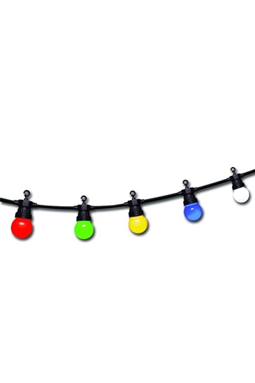 Venkovní světelný řetěz s 20 barevnými žárovkami vhodný např. pro oslavu na zahradě, v 5 barvách: červená, zelená, žlutá, modrá, bílá.Žárovky G50 (průměr 50 mm). 0,34 W / žárovka, 25 lumenů / žárovka. Délka 15 metrů. 60 cm mezi každou žárovkou; lze prodloužit až 3 stejné světelné řetězy.IP44