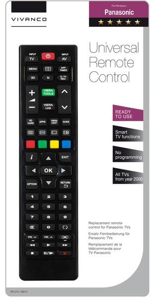 Náhradní dálkové ovládání je okamžitě připravené k použití, bez nutnosti programování. Lze využívat všechny hlavní funkce. Dálkový ovladač RR 270 je kompatibilní se všemi TV značek PANASONIC, vyrobených od roku 2000.