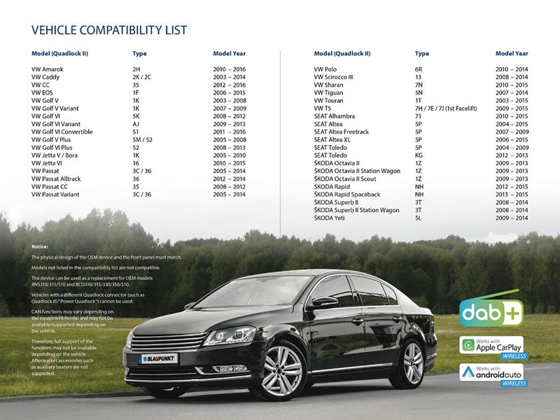 • Autorádio Youngtimer pro VW / Škoda / Seat, 7" dotykový displej, DAB+ a FM high-end tuner, bezdrátové Apple CarPlay a bezdrátové Android Auto, volitelné připojení CAN bus