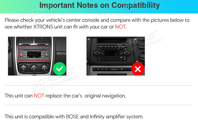 ** DŮLEŽITÉ POZNÁMKY: 1. Zkontrolujte prosím sítu a tvar středové konzoly vašeho vozidla, abyste se ujistili, že jednotka XTRONS bude pasovat do vašeho vozu. 2. Ujistěte se, že jednotka XTRONS pasuje do vašeho vozu. Tato jednotka NENAHRAZUJE původní navigační systém vozidla. 3. V případě, že se jedná o originální navigační systém, je nutné, abyste jej použili. Tato jednotka je kompatibilní se systémy zesilovačů BOSE a Infinity.