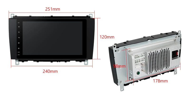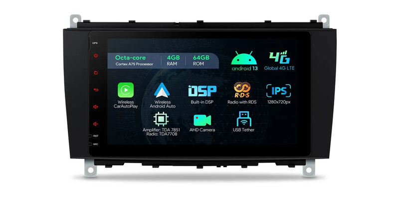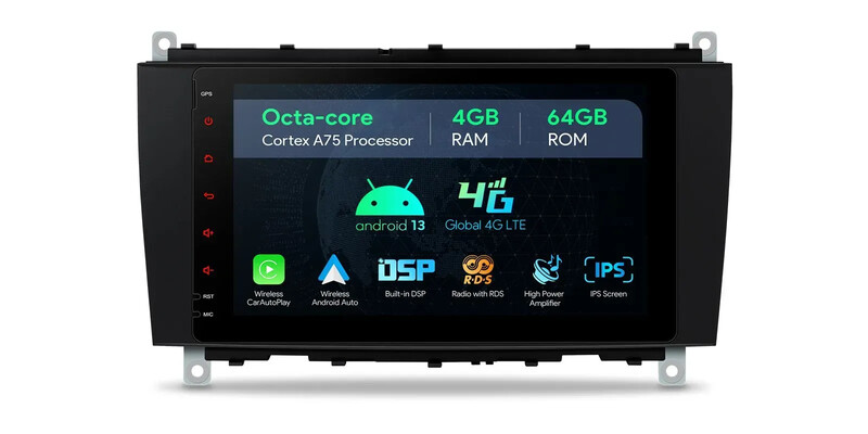 Android 13 Octa Core 4GB DDR4 RAM + 64GB Solid State ROM 8'' 1280x720 HD IPS obrazovka Autostereo multimediální přehrávač GPS Navigační systém s integrovaným globálním řešením 4G Vestavěné CarPlay & Android Auto & DSP Vysoce výkonný zesilovač TDA7851 Zesilovač USB Tethering Vyměnitelné uživatelské rozhraní Mirro08 Fotoaparát Mercedes HD RDS Rádio Podpora RDS-7 CLK-třída A209, CLK-třída C209