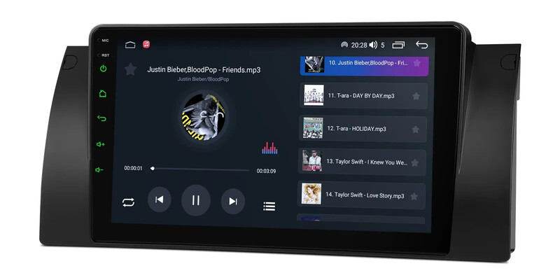 Optimalizovaný operační systém Android, osmijádrový procesor, 4 GB DDR4 RAM + 64 GB SSD ROM, 9" IPS displej s rozlišením 1280x720, GPS navigace, integrované 4G připojení, vestavěné funkce CarPlay a Android Auto a rádio SI4755 s RDS, zesilovač TCB001HQ, podpora AHD kamer, přehrávání videa v rozlišení 1080p pro BMW X5 E53