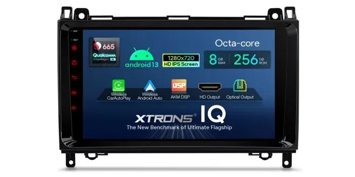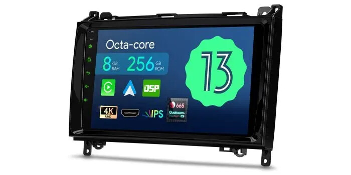 Android 13 Qualcomm 665 Octa Core 8GB RAM +256GB ROM 9'' 1280x720 QLED displej Multimediální přehrávač do auta GPS systém s integrovaným 4G řešením Vestavěný bezdrátový CarAutoPlay & Android Auto & AKM DSP Vlastní HDMI výstup Koaxiální/optický audio výstup Vhodné pro Mercedes-Benz třídy A, B, Sprinter, Viano a Vito