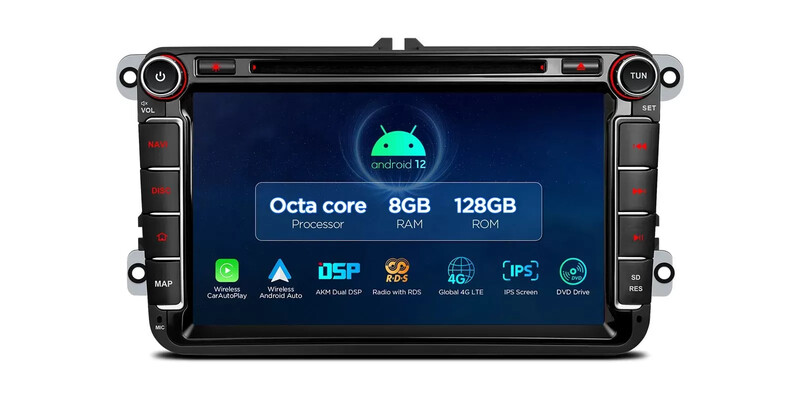 Android 12 Octa Core 8GB DDR4 RAM + 128GB Solid State ROM 8'' 1280x720 QLED IPS Screen DVD přehrávač do auta GPS navigační systém s integrovaným globálním 4G řešením Vestavěný CarPlay & Android Auto & ROHM DSP TDA7708 Rádio s RDS TDA7388 Zesilovač USB Tethering Podpora adaptivního uživatelského rozhraní AHD kamery pro Volkswagen/Skoda/Seat