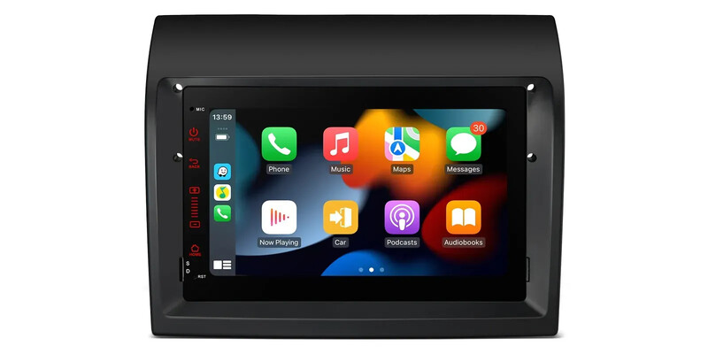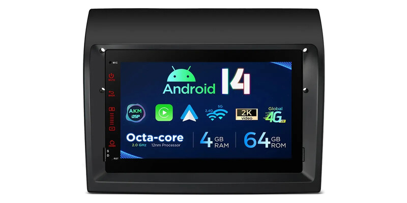 Android 14 Octa Core 4GB DDR4 RAM + 64GB Solid State ROM 7'' 1024x600 kapacitní dotyková obrazovka Auto Stereo GPS navigační systém s integrovaným globálním 4G řešením Vestavěný AKM DSP gyroskop Vestavěný CarPlay & Android Auto & AKM DSP SI4755 rádio s RDS TDA7388 zesilovač Podpora USB Tethering AHD kamery 2K Video Playback pro Fiat Ducat