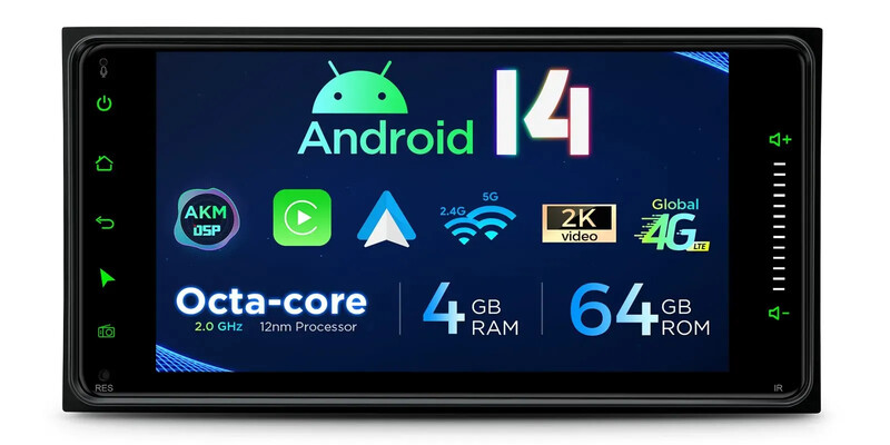 *Android 14 Octa Core Processor s 4 GB RAM (DDR4), 64 GB ROM (SSD) *Globálně kompatibilní 4G, podporuje 99 % operátorů po celém světě *Vestavěný AKM DSP * Dotykový displej G+G IPS -7palcový s rozlišením 1024*600 *Přehrávání videa 2K *Vestavěný bezdrátový CarAutoPlay a plně funkční Android Auto, Inteligentní hlasová interakce * Přesná GPS navigace * Okamžitý přístup ke kameře, podpora AHD kamery * Optimalizované dekódování CANbus * Dynamická atmosféra s univerzálními vícebarevnými LED světly * 4 sady motivů uživatelského rozhraní * Zrcadlení obrazovky * Nejnovější Bluetooth 5.0 *Dvojpásmový modul WiFi (2,4GHz a 5GHz) *Snadné sdílení mobilní sítě pomocí USB Tethering *PIP-Picture in Picture *Automotive Grade Hardware -STMicroelectronics TDA7388 Amplifier *Vestavěné 3 porty USB *Efektivní chladicí systém *Volitelné funkce (nutné další příslušenství) -OBD, kamera, DVR, DAB+, TPMS, HD výstup, RCA výstup, klávesnice