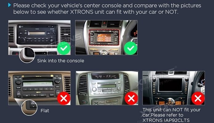 * DŮLEŽITÉ POZNÁMKY: - 1. Zkontrolujte prosím středovou konzolu svého vozidla a porovnejte ji s obrázky, abyste zjistili, zda jednotka XTRONS pasuje do vašeho vozidla. - 2. Systémy Hybird, SE a systémy s JBL nejsou s touto jednotkou kompatibilní. - 3. Pokud je rádio z výroby vašeho vozidla vybaveno velkým displejem, není tato jednotka kompatibilní.