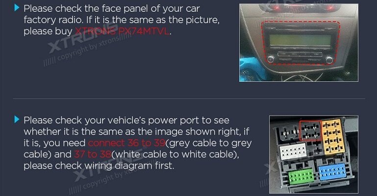 Zkontrolujte prosím čelní panel továrního rádia vašeho vozu. Pokud je stejný jako na dodaném obrázku, podívejte se na XTRONS PX74MTVL. Zkontrolujte prosím, zda je napájecí port vašeho vozidla stejný jako na dodaném obrázku. Pokud ano, je třeba připojit 36 k 39 (šedý kabel k šedému kabelu)a t (bílý kabel k bílému kabelu), nejprve zkontrolujte schéma zapojení. Chcete-li zachovat funkčnost kabelu/portu USB z výroby, odpojte 10 a připojte 41 k portu A (nejprve zkontrolujte schéma zapojení).