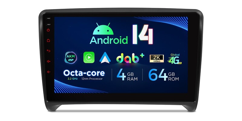 9palcový multimediální přehrávač s Androidem 14 a 4 GB RAM, vestavěný DAB+ AKM DSP, globální 4G IPS gyroskopické senzory pro Audi TT