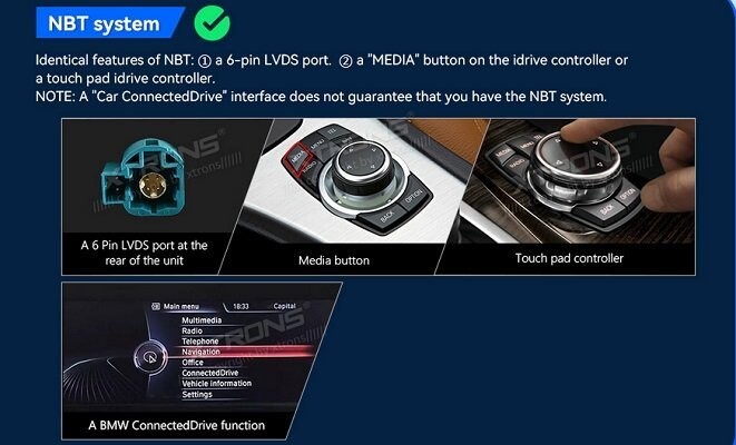 1. NBT systém :Identické vlastnosti NBT: ① 6pinový LVDS port. ② tlačítko „MEDIA“ na ovladači idrive nebo dotykovém ovladači idrive.