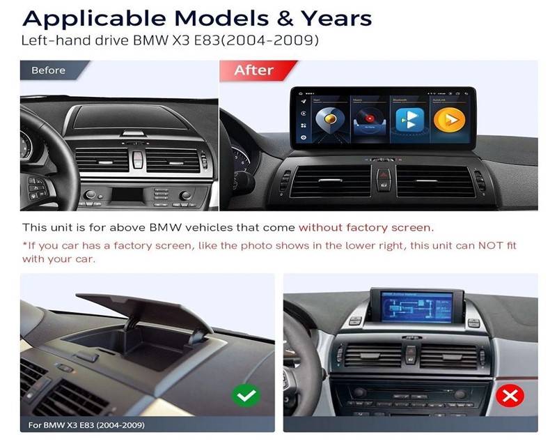 Tato jednotka funguje POUZE s originálním BMW bez tovární obrazovky. Pokud má vaše auto tovární obrazovku, tato jednotka se do vašeho auta NENÍ VHODNÁ.